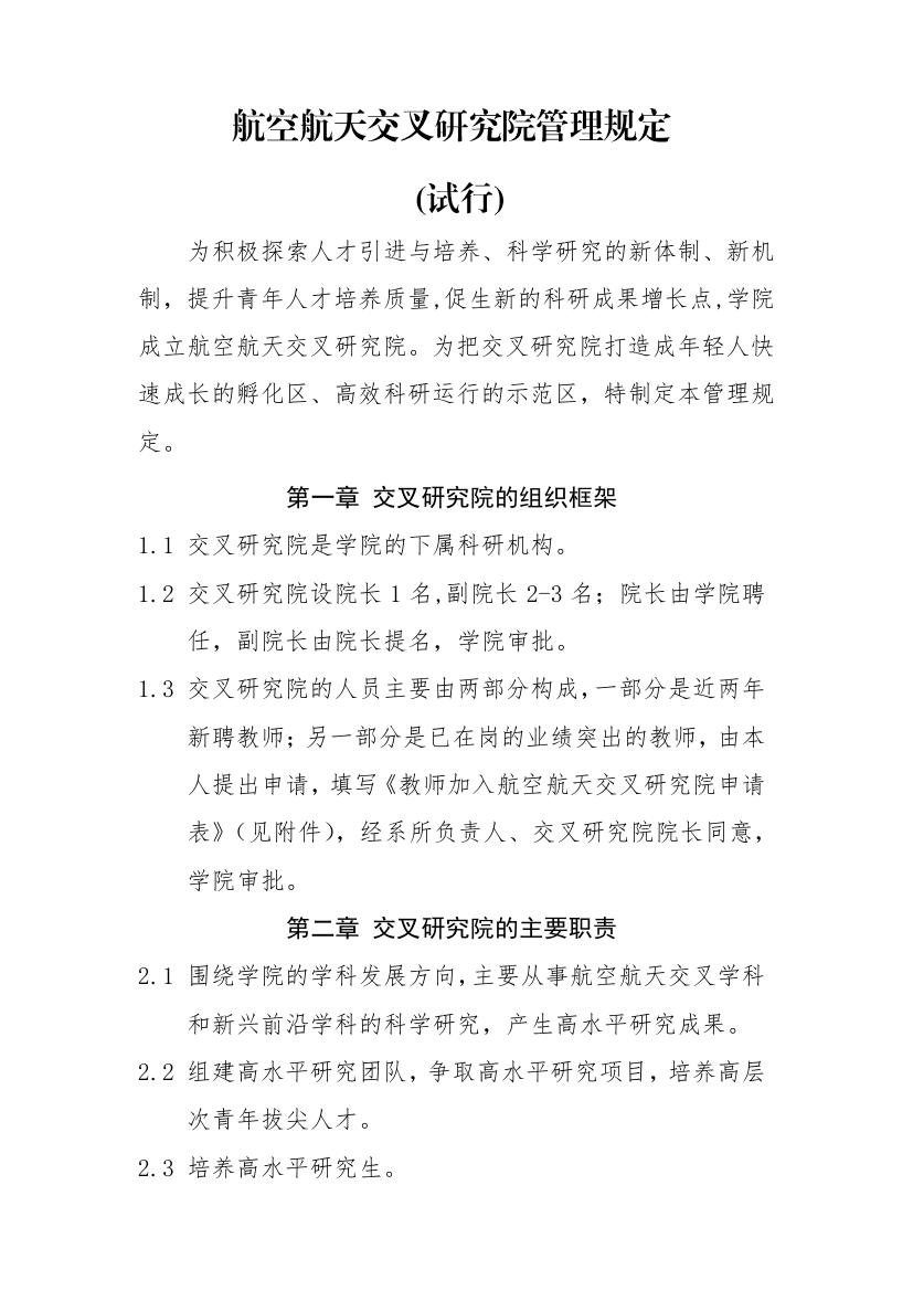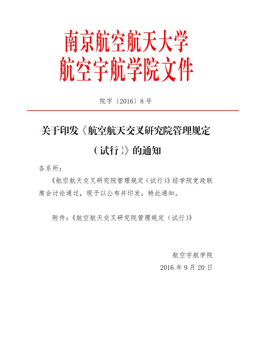 院字[2016]8号关于印发《航空航天交叉研究院管理规定(试行)》的通知