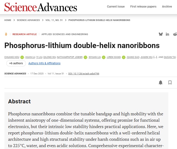 为攻克这一关键难题,南京航空航天大学郭万林教授、台国安教授与东京大学Naoji Matsuhisa副教授联合指导的中日合作团队,将原子级结构设计作为核心策略,开展了创新研究。团队成功构筑出一种在无机材料中极为罕见的“磷-锂双螺旋纳米带”全新结构,并系统揭示了其内在的优异环境稳定性、可调光学性质与独特的光热功能。该研究为从本征层面实现低维磷材料的性能与稳定统一提供了全新范式,相关成果以“Phosphorus-lithium double-helix nanoribbons”为题发表于国际顶级期刊 Science Advances。