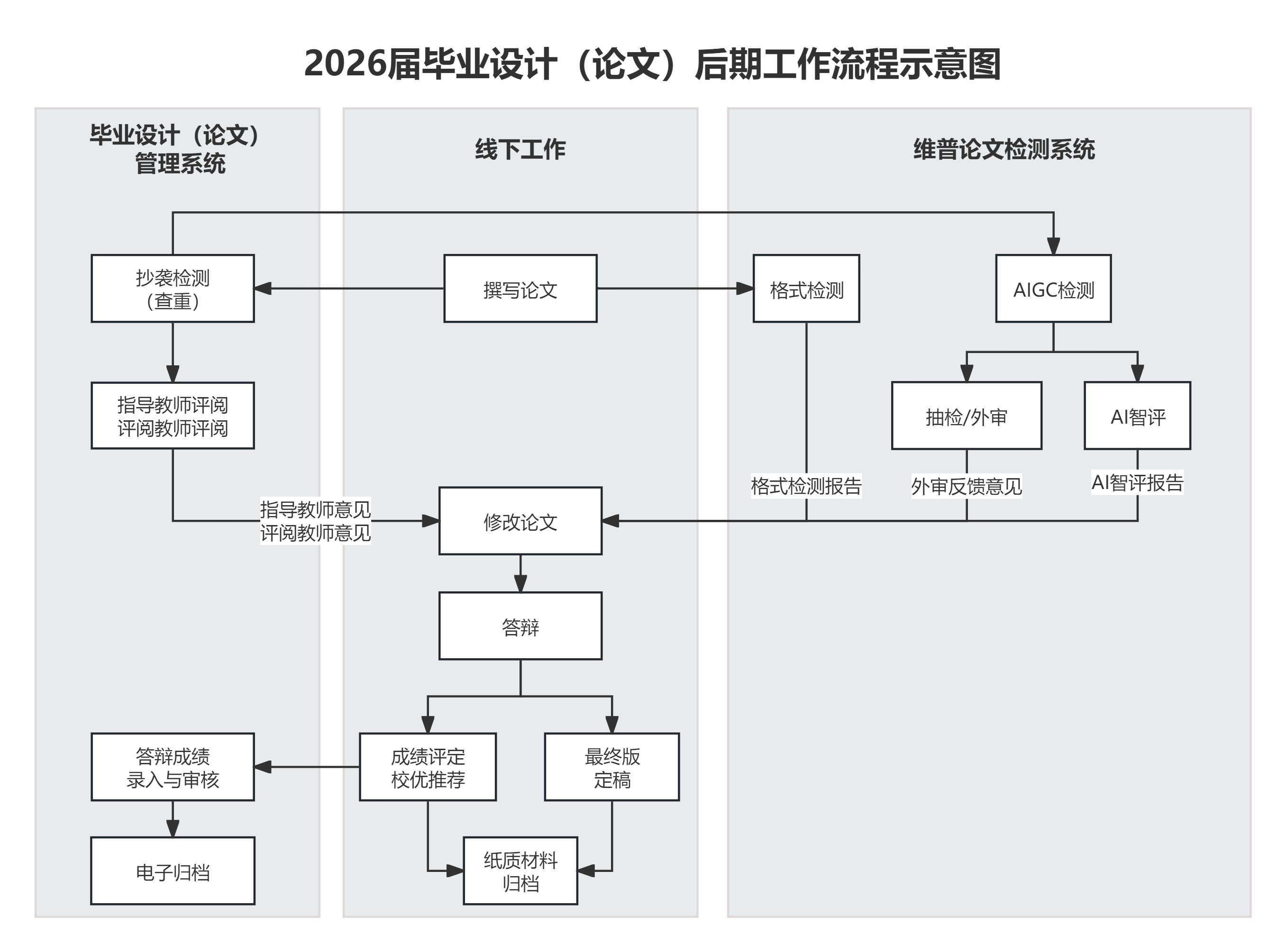 根据《关于做好2026届本科生毕业设计(论文)工作的通知》的要求,为扎实推进2026届本科生毕业设计(论文)(以下简称“毕设”)后期各项工作,充分运用人工智能等技术,严把毕设质量关学校引入了“维普论文检测系统”,主要用于AIGC检测、格式校对、外审抽检、智能评审等,相关工作流程如下图所示。