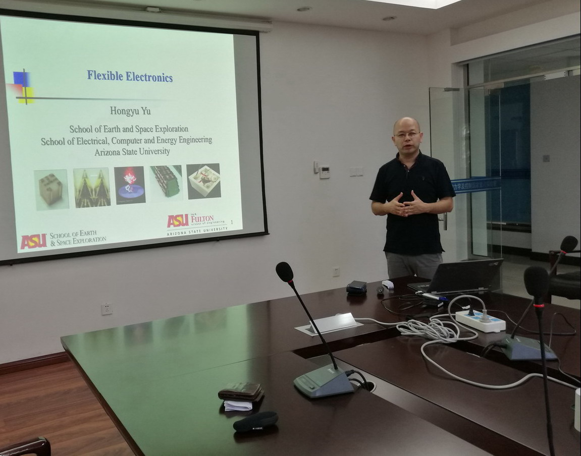应我校航空宇航学院机械结构力学及控制国家重点实验室吴大伟教授邀请,美国亚利桑那州立大学Hongyu Yu教授于2017年6月9日至16日访问了我校,并于6月13日至14日分别为我校师生做了题为“Smart Structures for Space Exploration”、 “Flexible electronics”、“Film bulk acoustic resonators based sensors”、“MEMS fabrication, devices and applications”系列学术报告。报告内容丰富、生动、精彩,系统的介绍了MEMS技术前沿,MEMS器件在航空航天、医学中前沿应用及MEMS技术未来发展趋势等,对我校相关科研工作具有借鉴作用。吴大伟教授主持了报告会。
