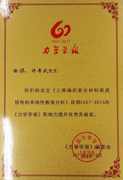 我院许希武教授指导的论文《三维编织复合材料渐进损伤的非线性数值分析》,被评为《力学学报》“影响力提升优秀贡献奖”论文。该论文为2007-2016年间,最具影响力的10篇论文之一。