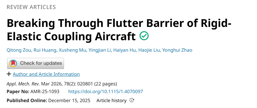 近日,由胡海岩院士、黄锐教授领导的团队在飞翼布局飞行器的刚-弹耦合颤振抑制技术研究方面取得突破。飞行试验表明,该团队成功实现结构强度极限内的刚-弹耦合颤振屏障突破,将安全飞行速度提高62.5%,创造了该领域的世界记录。相关研究成果以“Breaking Through Flutter Barrier of Rigid-Elastic Coupling Aircraft”为题发表于力学领域顶刊《ASME Applied Mechanics Reviews》(影响因子:16.1)。论文第一作者为我校航空学院博士生邹奇彤,通讯作者为南京航空航天大学黄锐教授和北京理工大学胡海岩院士,航空航天结构力学及控制全国重点实验室为论文第一完成单位。该研究工作获得国家自然科学基金委员会优秀青年科学基金、国家自然科学基金青年基金A类项目资助,是近20年来我国动力学与控制领域学者在该期刊发表的唯一论文。